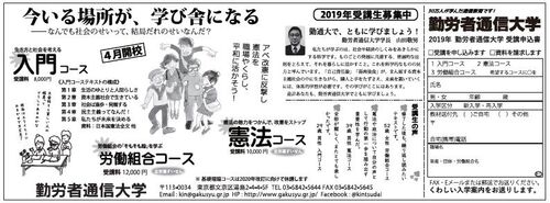 ◆激動の情勢の中、入門コースと憲法コースの成功を! ◆チューターを組織しよう! 勤通大2019年推進ニュース №3 2019年3月6日 発行:勤労者通信大学 ℡03-5842-5644 FAX03-5842-5645 E-mail:kin@gakusyu.gr.jp URL:http://www.jah.ne.jp/~gakusyu/ blog:…
